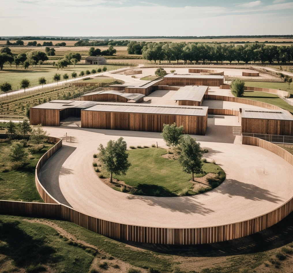 L’architecture et les aménagements intègrent des matériaux et des solutions durables, reflétant l’engagement du Studio Iroko en faveur de la transition écologique. Le projet se distingue par son ambition de réconcilier performance sportive et éthique animale, en offrant un environnement où chevaux et cavaliers évoluent dans des conditions optimales.
